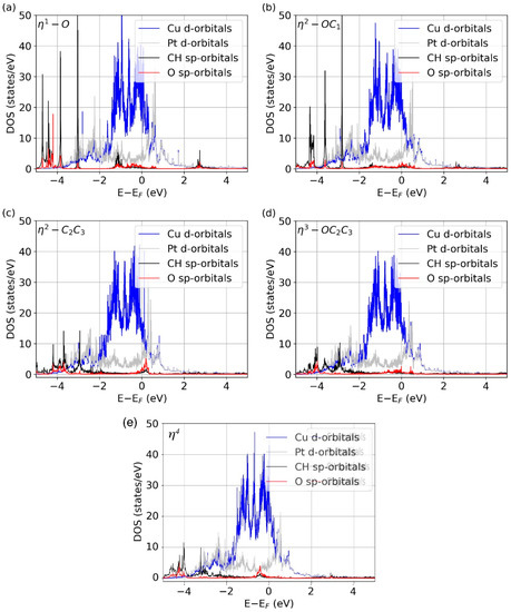 Projected DOS of the E-(s)-cis isomer of crotonaldehyde when adsorbed on the Cu2Pt/Cu(111) surface in the (a) η1-O, (b) η2-OC1, (c) η2-C2C3, (d) η3-OC2C3, and (e) η4 adsorption configurations.
