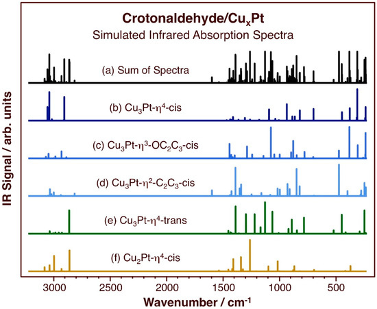 Calculated vibrational spectra of crotonaldehyde adsorbed on the indicated surfaces and configurations, namely, on (from top to bottom): (b) Cu3Pt-η4-cis, (c) Cu3Pt-η3-OC2C3-cis, (d) Cu3Pt-η2-C2C3-cis, (e) Cu3Pt-η4-trans, and (f) Cu2Pt-η4-cis; these are the most stable adsorption structures calculated in this study. The sum of all the spectra is shown at the very top (a) as well.