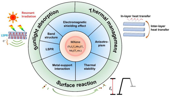 Transition metal carbides, nitrides, and carbonitrides (denoted MXenes) are likely to satisfy the requirements from all three aspects of the construction of desirable photothermal catalysts and are thus one of the most promising materials in photothermal catalysis. MXenes have become the hotspot of 2–Dimensional (2D) materials since the seminal research by Gogotsi et al. in 2011 [29]. Due to the 2D lamellar structure of MXenes as well as various kinds of surface terminations and exposed transition metal defects, MXenes exhibit distinct intriguing physical and chemical properties, which include tunable work function and band structure, excellent electrical conductivity, great electromagnetic shielding effect, a number of mechanical properties, etc. [30,31,32,33,34,35,36,37]. Therefore, MXene–based systems have found numerous applications as anode materials for fuel cells [38,39], in lithium–ion batteries [40,41], in photochemical or photodynamic chemotherapy [42,43], in sensors [44,45], in chemical catalysis and energy and environmental applications [46,47,48], etc. Importantly, MXene materials have been found to sustain broad features of localized surface plasmon resonance in the visible range, which allows them to make full utilization of sunlight by extending the light response to the near–infrared region [49,50,51]. Furthermore, the 2D nature of MXenes, their electromagnetic shield properties, as well as the abundance of vacancies and adsorbents are likely to contribute to the photothermal conversion and surface reactivity, as will be further elaborated in later sections [52,53,54,55]. Consequently, MXene materials may hold promising prospects for photothermal catalysis (Figure 1). However, the specific functionality of MXenes is heavily dependent on their structural properties, including their compositions, layer numbers, etc., which makes investigation and understanding of the structure–function relationship of MXenes of high significance for modulating them towards excellent photothermal catalytic performance. A limited understanding of the advances in fields of MXene–based materials for photothermal catalysis has been cultivated, which has, as of yet, hindered the development of MXene–based photothermal catalysts. Further theoretical and experimental studies are of great necessity to gain insight on the structure–activity relationship of MXene–based photothermal catalysts.