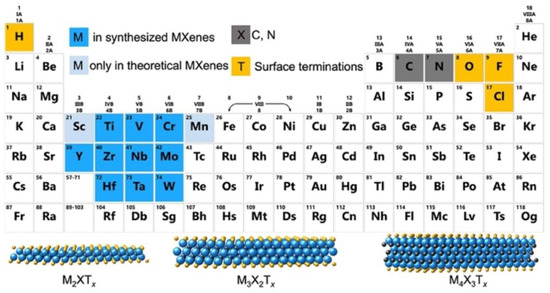- Naguib, M.; Mochalin, V.N.; Barsoum, M.W.; Gogotsi, Y. 25th Anniversary Article: MXenes: A New Family of Two-dimensional Materials. Adv. Mater. 2014, 26, 992–1005. [Google Scholar] [CrossRef]