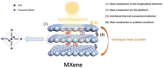 Besides the light absorption and light–to–heat conversion process, ideal heat management to prevent heat dissipation is also a key step in photothermal catalysis. Based on its 2D and lamellar structure, the heat transfer process in MXenes is highly anisotropic. It is generally conceived that MXenes possess larger thermal resistance for interlayer heat transfer processes than in–layer transfers, as the latter only involves heat conduction with the crystal lattices, whereas the former involves much more complicated transfer pathways. Overall, the interlayer heat transfer processes of MXenes are illustrated in Figure 4. When MXene nanosheets are irradiated, localized heating leads to an evident temperature increase on the exposed surface. In–layer heat conduction rapidly disperses the generated heat throughout the first (exposed) layer of MXenes (processes (1), (2)). When the conducted heat reaches the interface between crystal lattice layers and ambient medium, interfacial thermal convection and/or radiation (process (3)), as well as heat conduction in the ambient atmospheric or medium environment between layers (process (4)), could occur in order for interlayer heat conversion to happen. This is followed by an almost identical heat conduction process on the next layer as compared to the illuminated layer immediately after illumination and heat production. The presence of (3) and (4) could significantly increase the interlayer heat transfer resistance, which grants it better thermal insulation properties than conventional bulk materials.