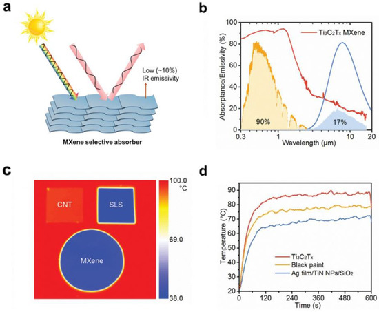 Light–matter interaction of MXene materials. (a) The high solar absorptance, high mid–IR reflectance, and low IR emissivity of MXenes; (b) Absorptance/emissivity spectra of a Ti3C2Tx film; (c) IR photographs of the SLS, CNT, and MXene on a hot plate with a constant temperature of 100 °C; (d) Temperature versus time of Nylon 66 membranes coated with Ti3C2Tx and metamaterial absorbers under 1 sun. (Reprinted with permission from Ref. [79]. 2021 John Wiley and Sons).