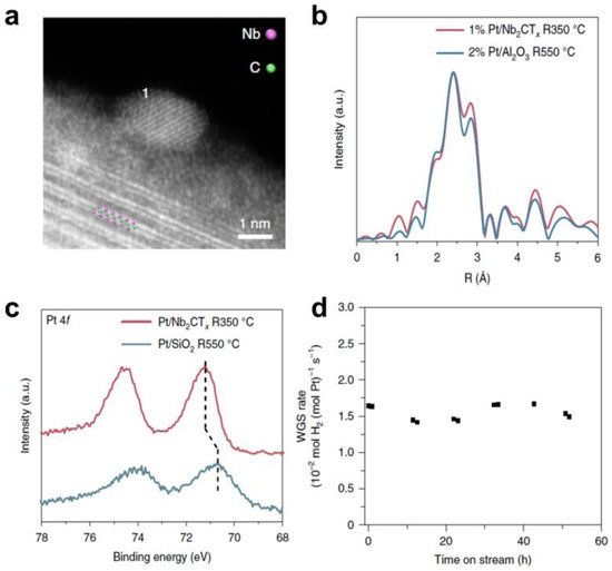 The reactive metal–support interaction of MXene–based catalysts. (a) HAADF–STEM images of typical nanoparticles supported by Nb2CTx MXene. The majority of each particle is hanging over the vacuum to avoid niobium interference from the support; (b) Fourier transform magnitude of the k2–EXAFS of the 2% Pt/Al2O3 sample treated at 550 °C and fresh 1% Pt/Nb2CTx treated at 350 °C in 3% H2/He; (c) Quasi in situ XPS spectra of platinum 4f of Pt/SiO2 reduced at 550 °C and 1% Pt/Nb2CTx reduced at 350 °C; (d) WGS rates normalized by the amount of platinum in the 1% Pt/Nb2CTx catalyst. The rates were measured at 300 °C. (Reprinted with permission from Ref. [80]. 2018 Springer Nature).