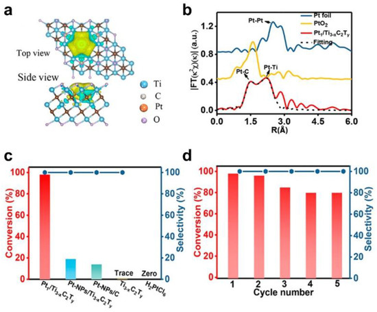Identification of active sites and catalytic performance of MXene–based catalysts. (a) Charge density difference of Pt1/Ti3−xC2Ty with a plain view (upper image) and a side–on view (lower image); (b) EXAFS FT k2–weighted χ(k) function spectra of Pt1/Ti3−xC2Ty and a reference; (c) Catalytic performance of the N–formylation of aniline using different catalysts; (d) Recycling test of Pt1/Ti3−xC2Ty for the catalytic N–formylation of aniline. (Reprinted with permission from Ref. [81]. Copyright 2019 American Chemical Society).