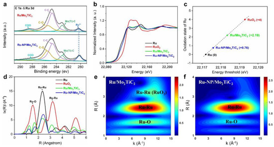 Chemical state analysis of the Ru/Mo2TiC2 catalysts. (a) C 1s and Ru 3d core–level XPS spectra of Ru/Mo2TiC2 and Ru–NP/Mo2TiC2. Ru/Mo2TiC2 exhibited a higher Ru oxidation state than Ru–NP/Mo2TiC2; (b) Normalized XANES spectra at the Ru K–edge of Ru, RuO2, Ru/Mo2TiC2, and Ru–NP/Mo2TiC2; (c) Oxidation states of Ru for reference and synthesized materials as determined from the edge positions in the Ru K–edge XANES spectra; (d) Corresponding FT–EXAFS spectra derived from the Ru K–edge of Ru, RuO2, Ru/Mo2TiC2 and Ru–NP/Mo2TiC2; (e,f) Wavelet transformation for the Ru K–edge EXAFS signals of Ru/Mo2TiC2 and Ru–NP/Mo2TiC2. (Reprinted with permission from Ref. [82], Copyright 2023 American Chemical Society).
