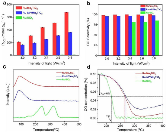 MXene–supported Ru clusters with a higher oxidation state of Ru exhibited a slightly lower activation temperature and thus a stronger ability for H2–assisted CO dissociation than Ru nanoparticles, while CO temperature–programmed desorption experiments suggested that CO desorption from Ru/Mo2TiC2 occurs at a lower temperature than from Ru–NP/Mo2TiC2. Thus, the special metal–support interaction of MXene–supported Ru cluster catalysts is favorable for the minor dissociation of H2 and kinetic desorption of CO, leading to the near–unity CO selectivity (Figure 9). Our research indicates that MXenes can not only stabilize the active metal center but also serve as superior photothermal supports for photothermal catalysis [82]. The rational construction of MXene–based photothermal catalysts is expected to reduce the energy consumption of the reaction and thus achieve better conversion efficiency under milder conditions.