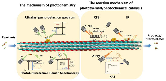 Thirdly, one fundamental issue in catalysis remains the understanding of the kinetic behavior of intermediates in the reaction process and thus the design of efficient catalysts from the most fundamental electronic structures. However, MXene–based catalysts are unable to reflect their original properties under catalytic conditions in many characterizations due to their active surface groups and their high oxyphilicity. At the same time, excellent light absorption and electromagnetic shielding limit its optical characterizations. This represents yet another important challenge for studies of MXenes in photothermal catalysis. As a possible solution, in situ or operando characterization techniques could prove extremely useful [93] (Figure 10). In situ X–ray absorption spectroscopy (XAS) and X–ray photoelectron spectroscopy (XPS) can accurately indicate the electron transfer and structural changes of MXene under catalytic conditions. Taking Diffuse Reflaxions Infrared Fourier Transformations Spectroscopy (DRIFTS) as an example, the excellent IR light absorption of MXene makes it difficult to collect signals from adsorbed intermediates on the surface under in situ catalytic reactions. Thus, the combination of various characterization tools and novel techniques is therefore crucial in the characterization of MXene and the structure-activity relationships of MXene–based photothermal catalysts.