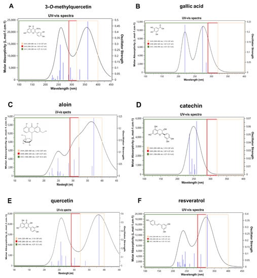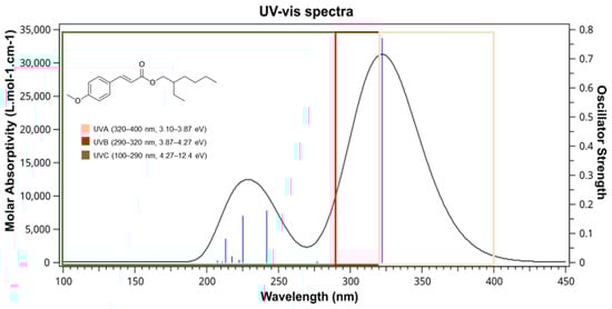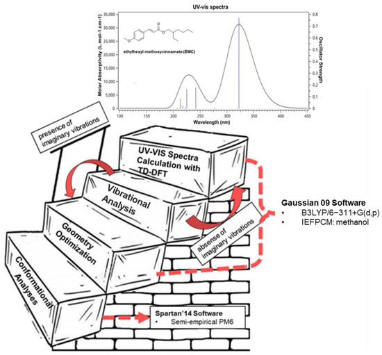 - Garcia, R.D.; Maltarollo, V.G.; Honório, K.M.; Trossini, G.H.G. Benchmark studies of UV–vis spectra simulation for cinnamates with UV filter profile. J. Mol. Model 2015, 21, 150. [Google Scholar] [CrossRef]