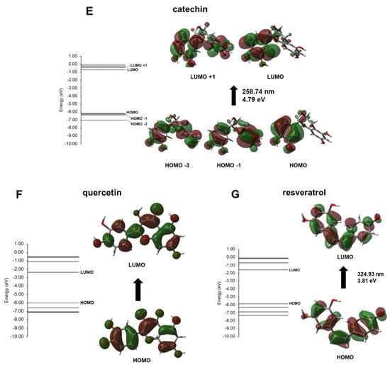 | catechin | 258.74 | 4.79 | H → L (+74%) H-1 → L (+9%) H-3→ L+1 (+7%) |