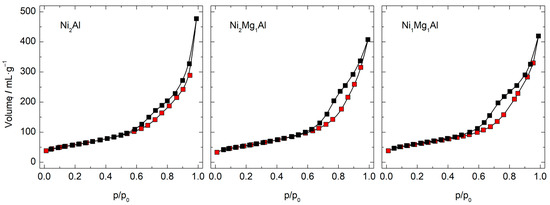 N2 physisorption isotherms of the LDH precursors calcined at 400 °C for 4 h. The red symbols are the adsorption branch, and the black symbols are the desorption branch of the isotherm.