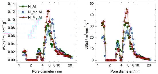 Pore volume (left) and surface (right) distributions of the LDH precursors calcined at 400 °C for 4 h and determined with the DFT model.