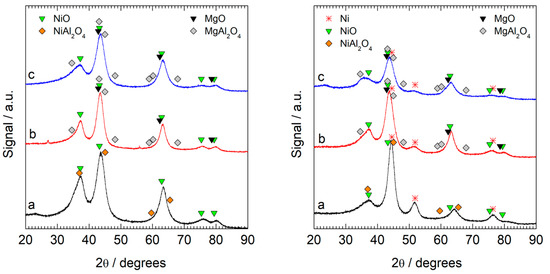 XRD patterns of the LDH precursors calcined at 400 °C for 4 h (left) and the catalysts after reduction at 500 °C for 1 h (right) (a: Ni2Al, b: Ni2Mg1Al, c: Ni1Mg1Al).