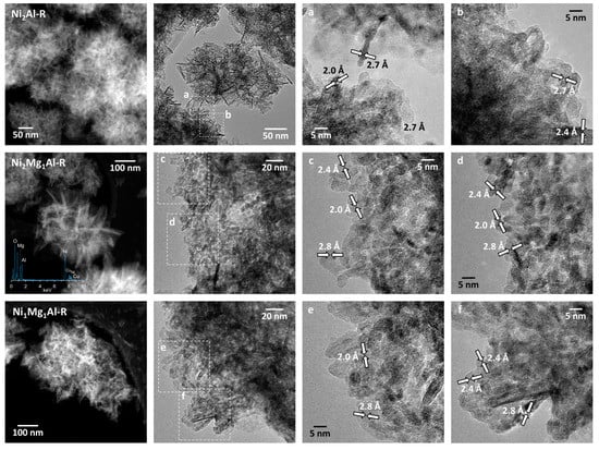 The structure of the reduced materials was investigated further by TEM (Figure 4). The HAADF-STEM image of sample Ni2Al-R showed a mixture of well-defined elongated structures and small nanoparticles. These nanoparticles appeared brighter in the image and likely corresponded to metallic nickel. The structures were well appreciated in the bright-field TEM image. HRTEM of insert “a” shows lattice fringes at 2.7 and 2.0 Å. Lattice fringes at 2.7 Å were ascribed to the (220) crystallographic plane of nickel aluminate and those at 2.0 Å corresponded well to the (111) crystallographic plane of metallic nickel. The HRTEM image from insert “b” showed lattice fringes at 2.7 and 2.4 Å, which were ascribed to the (220) and (111) crystallographic planes of nickel aluminate and nickel oxide (NiO). Therefore, the sample was constituted by Ni aluminate particles with elongated morphology of about 5–10 nm in size and round-shaped Ni and NiO nanoparticles with mean particle sizes of ca. 3–4 and 4–6 nm, respectively. The HAADF-STEM image of sample Ni2Mg1Al-R showed a poorly defined elongated morphology. The general EDX spectrum showed signals corresponding to Ni, Mg, Al, and O, while the Cu signal was caused by the sample grid. The bright-field TEM image revealed that the elongated structures were, in fact, constituted by very small nanoparticles, ranging in size from 3 to 8 nm. The enclosed areas “c” and “d” are shown in HRTEM mode where lattice fringes at 2.8, 2.4, and 2.0 Å are observed. These were ascribed to the (220) planes of the Mg aluminate spinel, to the (111) planes of NiO, and to the (111) planes of metallic Ni, respectively. The HAADF-STEM image of sample Ni1Mg1Al-R showed elongated nanoparticles that could be better distinguished with respect to the Ni2Mg1Al-R sample. Nevertheless, they were constituted by small nanoparticles as well, as shown in the bright-field TEM image, but the size of the nanoparticles was larger (ca. 5–15 nm). The areas enclosed in inserts “e” and “f” are shown in HRTEM mode. Insert “e” had lattice fringes at 2.8 and 2.0 Å that were ascribed to the (220) planes of Mg aluminate spinel and to the (111) planes of metallic Ni, respectively. In insert “f”, lattice fringes at 2.8 and 2.4 Å ascribed to the (220) planes of Mg aluminate spinel and to the (111) planes of NiO were seen. No other phases were identified.