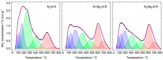 Deconvolution of the TCD signal was used to quantify the amounts of weak (α, Td < 220 °C) and intermediate (β, 220 °C < Td < 500 °C) sites (Table 5). The number of α sites increased slightly with the content of magnesium, from 0.34 mmol NH3·g−1 in Ni2Al-R to ca. 0.41 mmol NH3·g−1 in Ni1Mg1Al-R. The amount of β sites diminished with the content of Mg, from 0.66 to 0.31 mmol NH3·g−1 in Ni2Al-R and Ni2Mg1Al-R, respectively. Strong acidic sites (γ, Td > 500°C) could not be quantified reliably with the TCD detector because the ammonia adsorbed on those sites was oxidized to N2O at high temperature at the expense of the surface oxygen of the sample [46], and they were not included in the quantitative results. However, magnesium promoted the peaks at 600 and 700 °C. Magnesium decreased the total acidity from 1.00 mmol NH3·g−1 in Ni2Al-R to 0.74 mmol NH3·g−1 in Ni1Mg1Al-R and 0.67 mmol NH3·g−1 in Ni2Mg1Al-R. Due to the similar surface areas of the three catalysts, the surface density of acidic sites followed the same trend (Table 5).