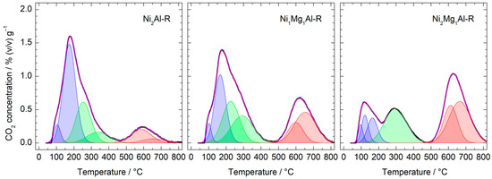 The basicity of the reduced catalysts was measured by CO2-TPD (Figure 7) and the content of basic sites calculated by deconvolution of the TCD signal (Table 6). Ni2Al-R had the higher concentration of weak sites (Td < 200 °C) and very few strong sites (Td > 500 °C). Addition of magnesium in Ni1Mg1Al-R promoted medium and strong basic sites and decreased the weak. The total content of basic sites in Ni2Mg1Al-R was lower, and it had very few weak sites but the highest content of strong sites. The large difference in the content of low and medium-low basic sites of this catalyst can be explained by the differences derived from the higher M+2/M+3 ratio used to synthesize the LDH precursor.
