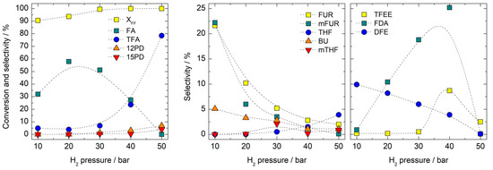 The effect of hydrogen pressure was studied at 190 °C and 4 h. Furfural conversion was 90.6% at 10 bar, 99.4% at 30 bar, and complete above that (Figure 8). A variety of products with selectivity that changed with hydrogen pressure were identified. At 10 bar, furfural was hydrogenated to furfuryl alcohol (FA, 32%) as the main product and 2-methylfuran (mFUR, 21.6%), but it was also decarbonylated to furane (FUR, 22%). Minor hydrogenation products included tetrahydrofurfuryl alcohol (TFA, 4.9%) from the hydrogenation of FA and n-butanol (BU, 5.1%) from the ring-opening hydrogenolysis of FUR. In addition, difurfuryl ether (DFE, 9.9%) and 2-(diethoxymethyl)furan (FDA, 0.9%) were obtained. Both evolved through the formation of acetals on the acidic sites of the catalyst surface by reversible nucleophilic addition of FF with FA or ethanol (Scheme 1), a reaction path that has been previously observed on different catalysts. The formation of FDA from FF and ethanol was reported under mild hydrogenation conditions on Pd/UiO-66 [9] and on a Pd/C catalyst, where it was identified as the key intermediate in the production of tetrahydrofurfuryl ethyl ether (TFEE) [47]. Similarly, 2-(diisopropoxymethyl)furan resulting from acetylation of FF with isopropanol was reported on NiO [48], NiO-Al2O3, and ZnAl2O4-Al2O3 [49] and on Pd-exchanged β-zeolites [50] during the catalytic transfer hydrogenation of FF with 2-propanol. During FF hydrogenation under mild conditions over Pd/HPA, 2-(isopropoxymethyl)furan was formed as an intermediate compound in weak acidic sites that was then converted to TFA on basic sites [8].