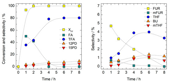 The effect of reaction time was investigated with the Ni2Mg1Al-R catalyst at 190 °C and 50 bar of hydrogen for up to 8 h (Figure 9). FF conversion was 93.4% after 1 h, and the main products were FA (50%) and TFA (36%), together with FUR (4.7%), 12PD (3.2%) and minor amounts of the other products. FF conversion was complete after 2 h. After 4 h, FA was not present, and TFA reached a selectivity of 78.5%, with 7.0% 12PD, 4.5% 15PD, and 3.9% THF. Extending the reaction time to 8 h had little impact on the composition of the product mixture. Selectivity to TFA was constant at ca. 80%, and 12PD and 15PD only increased marginally, reaching 9.0% and 4.8% after 8 h, respectively, showing that the catalyst was not significantly active for the hydrogenolysis of TFA.