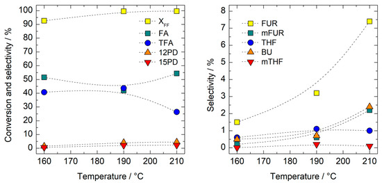 The effect of temperature was tested at 160, 190 and 210 °C, with the Ni2Mg1Al-R catalyst at 50 bar and 2 h. FF conversion was 92.7% at 160 °C, and it was complete at higher temperature (Figure 10). Temperature favored the decarbonylation of FF to FUR, which grew from 1.5% at 160 °C to 7.4% at 210 °C, even if FA was always the main primary product (51.5% and 54.3% at 160 °C and 210 °C, respectively). Similarly, the selectivity to mFUR and BU also grew with temperature. It is worth mentioning that the effectivity of the catalyst to hydrogenate the double bonds (π bonds) in furan rings decreased with temperature. The selectivity to TFA was actually lower at 210 °C (26.4%) than at 190 °C (43.6%), while that of FA was higher. Additionally, the selectivity to THF and mTHF was virtually unchanged from 190 to 210 °C, even if the amount of FUR and mFUR grew. Finally, raising the temperature from 190 to 210 °C had no impact on the selectivity to 12PD and 15PD.