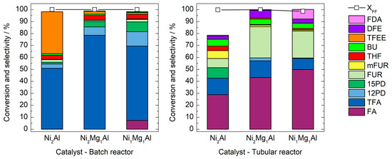 Furfural conversion and product selectivity using 5 wt.% FF in ethanol at 190 °C: influence of the catalyst composition and the reactor type. Left: batch reactor at 50 bar of H2 for 4 h. Right: tubular reactor at atmospheric pressure using a WHSV of 2.85 gFF·gcat−1·h−1 and a hydrogen-to-furfural molar ratio of 12.7:1.0.