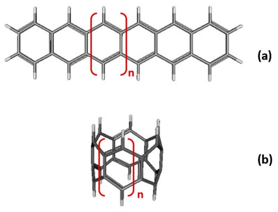 Chemical structure of: (a) [n]-acenes; (b) [n]-CC carbon nanobelts. In both cases, n is the number of fused rings.