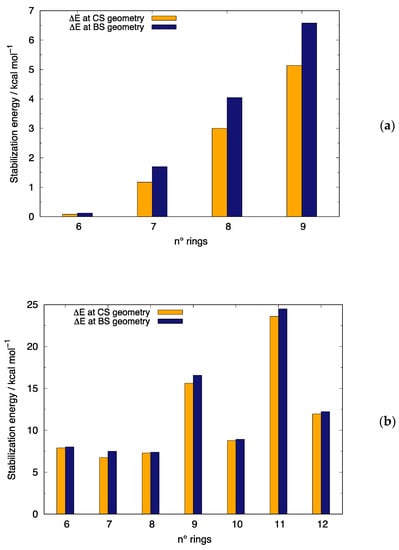 Because geometry optimizations at the same level of theory were reported in previous works for linear acenes [] and [n]-CCs [,,], we do not discuss geometrical detail that can be found elsewhere. However, it is interesting to consider the stabilization associated with the open-shell character that develops for linear acenes only for n ≥ 6 and for all the [n]-CCs investigated. In each panel of Figure 2, the stabilization only due to the constraint relaxation in the unrestricted wavefunction (orange bars) is compared with the total stabilization including also the contribution associated with the geometrical relaxations from the CS to the BS structure (blue bars) (numerical data collected in Table S5). As previously observed, the overall stabilization increases with molecular size for both linear acenes and carbon nanobelts on account of their increasing di-/poly-radical characters. It is also commonly found that a large fraction of the total stabilization is due to relaxation of wavefunction constraints.