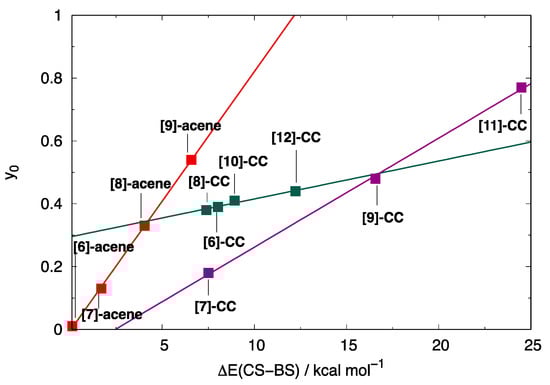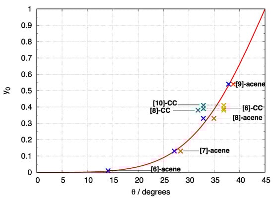 In Figure 4 (red curve), Equation (5) is also plotted for reference. Note that orbital rotation of 45° implies the formation of fully localized BS orbitals and corresponds to the maximum di-radical character = 1. When the rotation angle is smaller, decreases and becomes when CS and BS orbitals coincide. There is a general good agreement between the orbital rotation angle determined from the BS and CS orbitals of each molecule and the theoretical red curve. The largest deviations observed for [n]-CCs compared to [n]-acenes mainly arise from additional contributions to the BS orbitals from other CS occupied/unoccupied orbitals. Such extra contributions are in line with the generally larger tetra-radical character of [n]-CCs compared to [n]-acenes and suggest that in these cases the 2e–2o model may not fully apply.