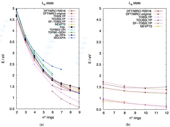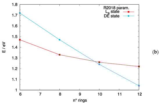 In contrast with the singly excited state, comparably fewer investigations have considered the prediction of the DE state of [n]-acenes, and in Figure 6a we collect the most relevant results taken from the literature, along with our computed results. In this case, little experimental data are available for [n]-acenes: for the smaller acenes, two-photon absorption (TPA) investigations [,] identified a low-lying state of Ag symmetry. Notably, while for []-acene the experimental data from TPA (black empty squares in Figure 6) are nicely reproduced by most calculations, for []-acene, the experimental excitation energy of the TPA active state is much lower compared to the predictions of the DE state. This can be reconciled in the light of our DFT/MRCI wavefunction analysis. These calculations show two low-lying excited states of Ag symmetry for naphthalene, the highest of which is the DE state while the lowest is only marginally affected by doubly excitations and its computed excitation energy (red isolated circle and square in Figure 6a, for the R2018 and original parametrizations, respectively) is in much better agreement with the experimental TPA data. On the computational side, apart from []-acene, the lowest Ag excited state is always the DE state for longer acenes. Overall, we note that DFT/MRCI calculations with both parametrizations are in very good agreement with the available experimental data [,,] and with the results of pp-RPA calculations []. SF-TDB3LYP excitation energies show an acceptable trend, with a slightly too-steep energy decrease with the acene length. NEVPT2 and MCCEPA [] appear to overestimate the excitation energy of the DE state for longer [n]-acenes. Finally, an unexpected excitation energy increase with the extension of the oligoacene is determined by TDUB3LYP calculations. Similar trends characterize the predictions of the DE state for [n]-CCs and, extrapolating from [n]-acenes, we can conclude that the quality of the DFT/MRCI results is expected to be comparable to the pp-RPA calculations also for the carbon nanobelts.