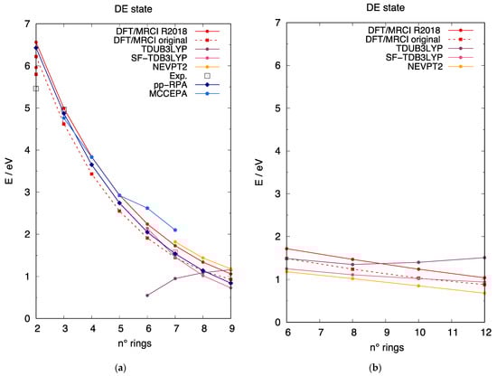 The and states display a different nature (covalent and ionic) challenging time dependent DFT (TDDFT) calculations, whose quality strongly depends on the type of functional [,,,,]. Because double excitations contribute to these low-lying excited states [], a balanced description was reported by employing double hybrid functionals [] and carefully assessed [] for a set of non-empirical double-hybrid density functionals developed in recent years []. Low-lying excited states were also investigated at other levels of theory, including DFT combined with multi-reference configuration interaction (DFT/MRCI) [,], particle–particle random-phase approximation (pp-RPA) [], complete active space self-consistent field (CASSCF) supplemented with multi-reference second-order perturbation theory (CASPT2) [] or multi-configuration-coupled electron pair approximation (MCCEPA) []. Despite the impressive amount of computational investigations, the DE state of linear acenes has received comparably less attention [,,].