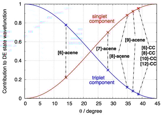 Contributions of the singlet and triplet components to the DE state described at TDUDFT level according to Equation (6) as a function of BS orbital rotation angle . The investigated linear and cyclic acenes are placed on the graph with crosses based on their computed BS orbital rotation angle.