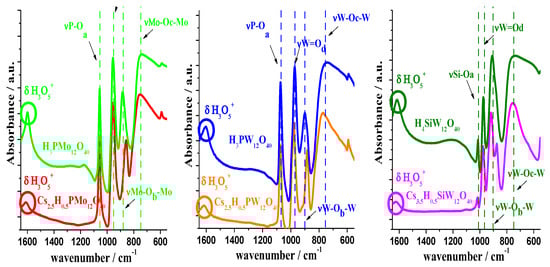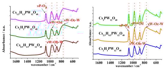 Infrared spectroscopy is a valuable tool to obtain information about the primary structure of Keggin HPAs (i.e., heteropolyanion). The typical chemical bonds present in the Keggin anion have their main vibrations bands placed at the fingerprint region between 400 to 1300 cm−1 in the infrared spectrum. To check if the primary structure was kept constant after the synthesis of cesium salts, it needs to verify if any shoulder, new band, or strong shift has occurred in the characteristic vibration bands of main chemical bonds after the synthesis.