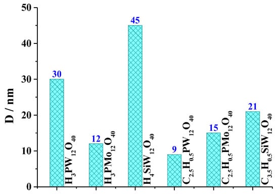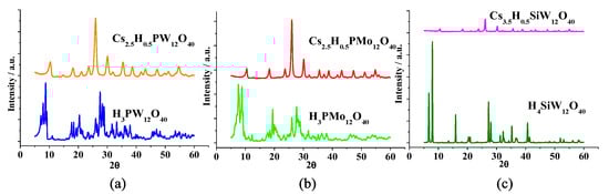 The powder X-rays diffraction patterns of the cesium salts of silicotungstic, phosphomolybdic, and phosphotungstic acids were obtained by X-ray diffraction (XRD) in a Bruker D8 Discovery diffractometer, operating at 40 kV acceleration voltage, 40 mA current, in the copper emission line (Cu-Kα, λ = 1.5406 Å), with a scanning rate of 1°/min for a 2θ angle of 5–80° [35,36,37]. The diffractograms of Keggin heteropolyacids and their cesium salts are displayed in Figure 3.