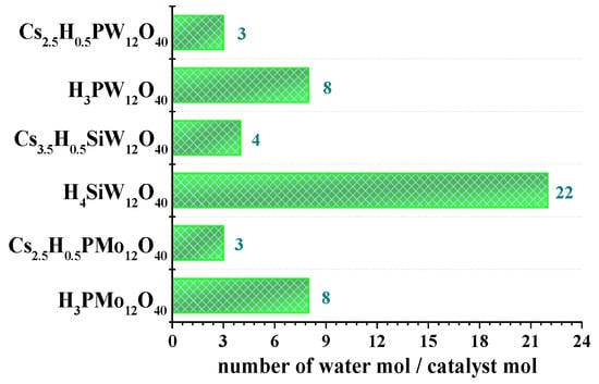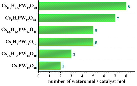 Figure 7 shows the effect of cesium load on the number of hydration water molecules. An increase in cesium load resulted in a lower number of water molecules per mol of heteropolyanion. It can be a consequence of the great ionic radium of cesium; the higher the cesium content, the more difficult was for the water molecules to interact with the Keggin anion, and, consequently, lower the hydration level.