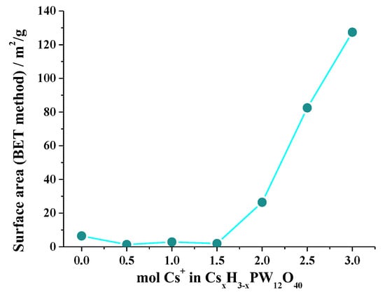 However, for lower cesium content the increase in surface area was less impacted. Conversely, when 2.0 or more Cs mol were present in the heteropolyanion, the surface was remarkably enhanced (Figure 10).