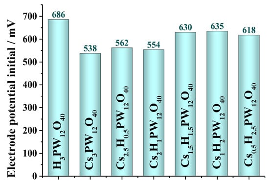 The initial electrode potential of suspensions in acetonitrile of the cesium phosphotungstate salts and solution of precursor phosphotungstic acid (adapted from ref. [36]).