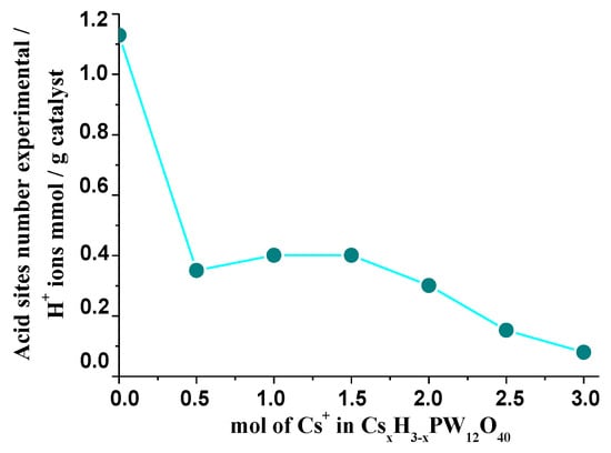 The partial replacement of protons in Keggin-type HPAs with larger cations can make them insoluble in water. Although the amount of Brønsted acid sites in CsxH3−xPW12O40 became lower as compared to H3PW12O40, the strength of Brønsted acidity for CsxH3−xPW12O40 was still preserved [48]. When Keggin HPAs are compared to the typical inorganic acids, their greater acidity is ascribed to the size and charge of the anion [49]. However, even cesium is included in the secondary structure of HPAs, these cations ca be hydrolyzed generating H+ ions that contributes to the acidity of salts [50] and, thus, weaken the attraction of the proton to the anion.