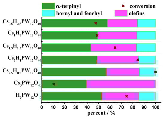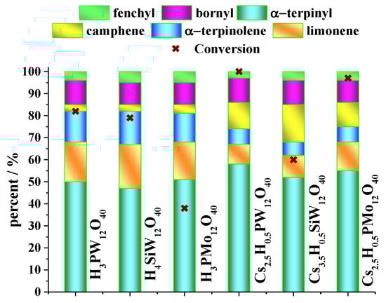 Conversion and selectivity of Keggin HPAs or their cesium salts-catalyzed reactions β−pinene reaction with methyl alcohol (adapted from ref. [36]).