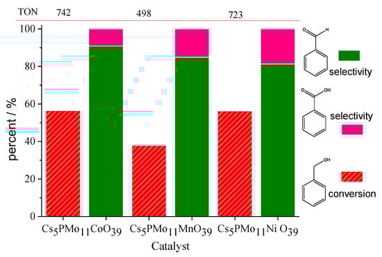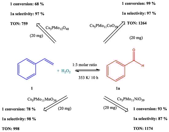 When the lacunar heteropoly sodium salt is in the solution, it acts as a “monodentate ligand” and can bind the metal cation. Therefore, the addition of CsCl precipitates this “POM complex”, which can act as a bifunctional catalyst. Besides the activity of heteropolyanion containing the addenda metal active sites (i.e., Mo or W), now the POM has yet a metal cation that frequently can trigger a synergism with the heteropolyanion, due to its catalytic activity [46].