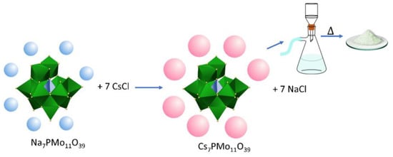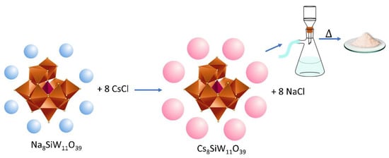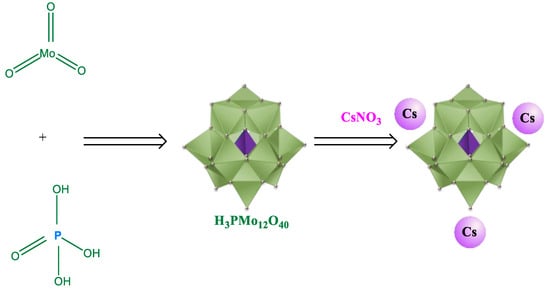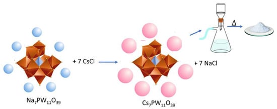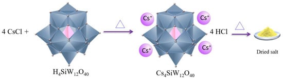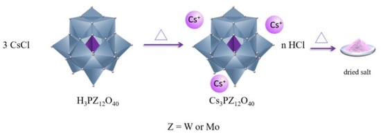 Those authors heated the slurry to 100 °C for 6 h under vigorous stirring, and then evaporated to dryness at 110 °C, obtaining the Cs3PMo12O40 solid salt [43]. This same procedure can generate cesium phosphotungstate exchanging the molybdenum for tungsten oxide. Similarly, replacing the phosphoric acid with the silicic acid led to the obtention of cesium silicotungstate salt.
