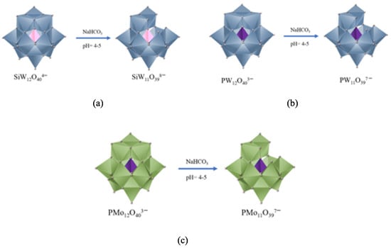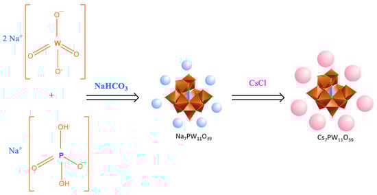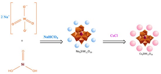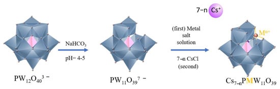 Cesium lacunar salts CsyXM11O39 (X = Si or P; M = W or Mo; y = 8 or 7, respectively) have been synthesized by precipitation according to the procedure adapted from the literature [21,41]. This procedure can be carried out in a two-step synthesis. In the first procedure, the lacunar heteropolyanion is obtained by hydrolysis saturated anion present in precursor acid (Scheme 4); after the hydrolysis, the solutions of HPAs (i.e., H3PW12O40, H3PMo12O40, or H4SiW12O40) become solutions of unsaturated anions (Scheme 4).