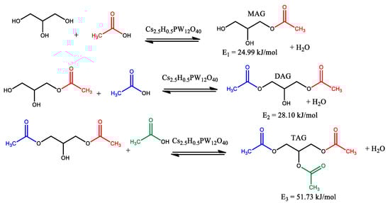 In this sense, Veluturia et al. studied the glycerol esterification over cesium partially exchanged phosphotungstic acid salts [54]. Scheme 14 shows the main reaction products of glycerol esterification; the terminal hydroxy groups are preferentially esterified. Consequently, monoacetyl glycerol, 1,3-diacetyl glycerol, and triacetyl glycerol are the main products (i.e., MAG, DAG, and TAG, respectively). The reactions were carried out over a partially exchanged-cesium phosphotungstate (Cs2.5H0.5PW12O40). Those authors determined through kinetic study that this reactivity sequence is a consequence of trends observed in the activation energy of these reactions (Scheme 15).