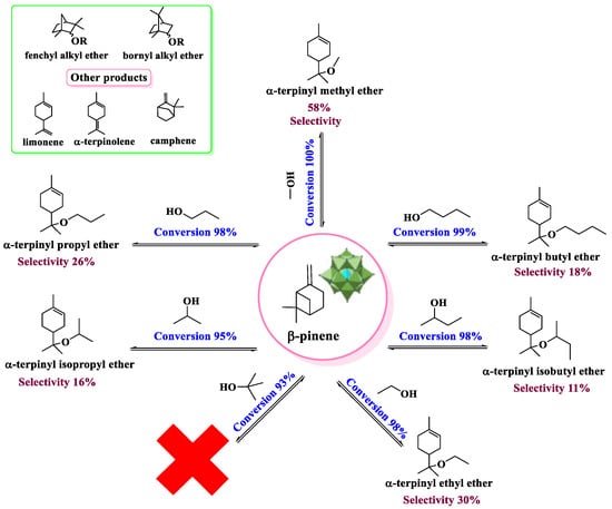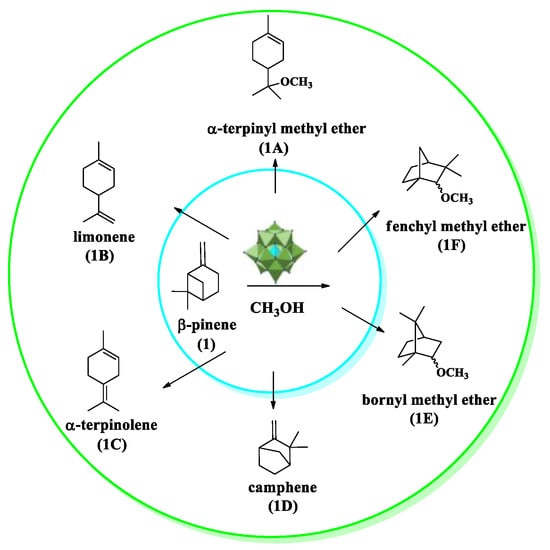 In this regard, partially exchanged cesium salts were also effective catalysts in monoterpenes etherification reactions with alkyl alcohols [36]. Da Silva et al. carried out the β−pinene etherification with methyl alcohol and verified that at those conditions, the monoterpene substrate undergoes skeletal rearrangement reactions giving mainly α−terpinyl methyl ether (1A) as the main product (Scheme 15). This is a product of the nucleophilic addition of methyl alcohol to the tertiary carbocation resulting from the opening of the four-membered ring of β-pinene.
