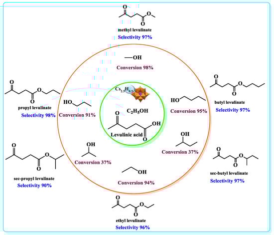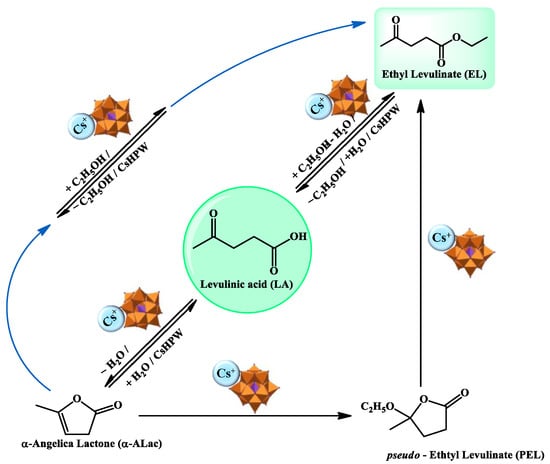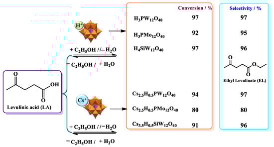 - Lopes, N.P.G.; Da Silva, M.J. Cesium partially exchanged heteropolyacid salts: Efficient solid catalysts to produce bioadditives from the levulinic acid esterification with alkyl alcohols. React. Kinet. Mech. Catal. 2022, 135, 3173–3184. [Google Scholar] [CrossRef]