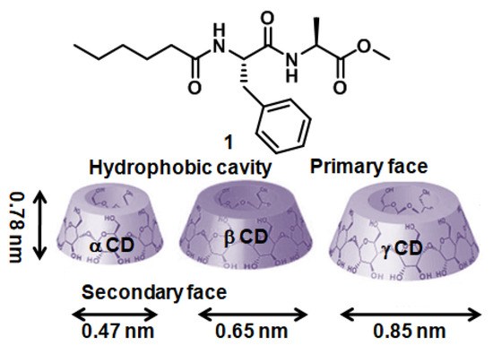 The amphiphile 1 (Figure 1) containing caproic acid at the N terminus, D-phenylalanine, L-alanine, and methyl ester at the C terminus was synthesized by solution reaction. The synthesized compound and all intermediates were purified and characterized by 1H NMR, 13C NMR, FT-IR spectroscopy, and ESI-MS spectrometry (Supporting Information). The motivation was to develop a compound that will form a supramolecular polymer and gel by including a complex with cyclodextrin. We tested all three macrocyclic oligosaccharides (α-CD, β-CD, and γ-CD) (Figure 1). Cyclodextrin contains six/seven/eight glucose subunits covalently connected by α-1,4 glycosidic bonds (Figure 1) [34]. The cyclodextrin has a toroid shape with a primary face (smaller opening) and a secondary face (larger opening). The 0.78 nm-thick toroid has a hydrophobic cavity diameter of 0.47 nm for α-CD, 0.65 nm for β-CD, and 0.85 nm for γ-CD (Figure 1). The cavity inside cyclodextrin may host aliphatic or aromatic hydrocarbons and form an inclusion complex [35]. The exterior of cyclodextrin is hydrophilic, which helps to solubilize in water.