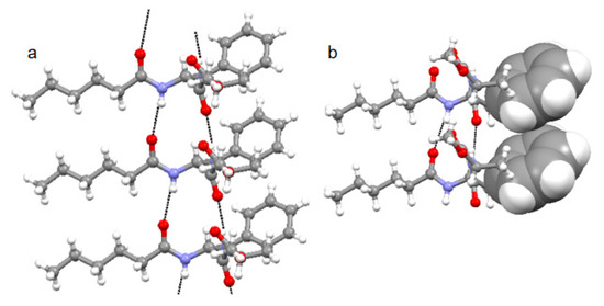 (a) The solid-state structure of compound 1 showing a parallel sheet-like structure stabilized by multiple intermolecular hydrogen bonds. Intermolecular hydrogen bonds are shown as black dotted lines. (b) Solid state structure of compound 1 showing edge-to-edge π–π stacking interaction. π–π stacking interactions are shown as a space fill model; [C in grey, O in red, N in blue].