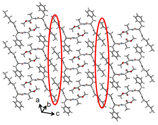 The packing diagram shows that compound 1 was further assembled to form a supramolecular corrugated sheet-like structure along crystallographic a and c directions (Figure 4). The corrugated sheet-like structure was stabilized by dispersion forces between caproic acid alkyl chains (Figure 4). The crystal data and refinement statistics for compound 1 are listed in Supplementary Materials Table S1.