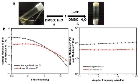 (a) The image showing compound 1 and β-CD supramolecular gel in DMSO-H2O. (b) Effect of strain on supramolecular gel in DMSO-H2O; (c) Effect of angular frequency on supramolecular gel in DMSO-H2O.
