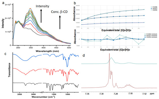 (a) The emission spectra of compound 1 show bands at 348 and 408 nm. The emission intensities of the bandsgradually increase with the gradual addition of β-CD (excitation at 280 nm). (b) The binding stoichiometry of compound 1 and β-CD in DMSO by fitting emission data at 348, 327, and 408 nm using the bindfit methods, http://supramolecular.org (accessed on 21 February 2023). (c) Solid state FT-IR spectra of compound 1 (black), β-CD (blue), and xerogel obtained from compound 1 and β-CD supramolecular gel in DMSO-H2O (red). (d) Part of the 1H-NMR spectra of compound 1 (red); compound 1 and β-CD Gel in DMSO-D6 (blue), showing shifting of compound 1 aromatic peaks with the addition of β-CD.