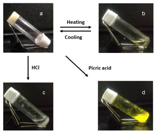 The images showing compound 1 and β-CD supramolecular gel in DMSO-H2O is (a,b) thermo-responsive; (c) HCl responsive; and (d) picric acid-responsive.