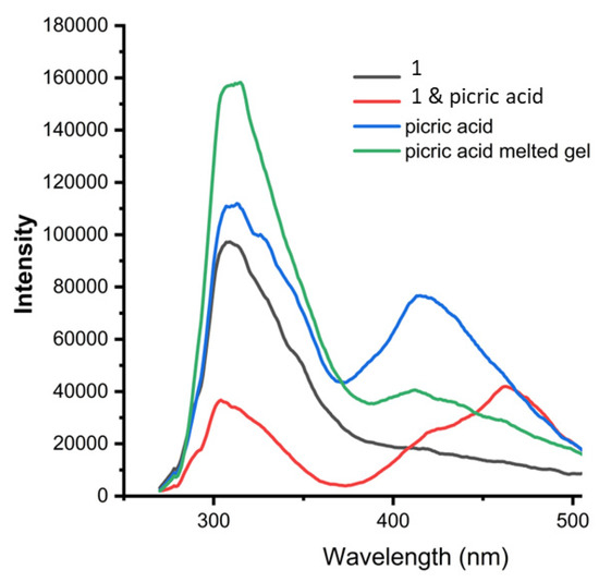 Furthermore, we studied the effect of picric acid on compound 1 and β-CD gel in DMSO by UV-Vis spectroscopy (Supplementary Materials Figure S3) and fluorescence spectroscopy. Figure 9 shows thatcompound 1 exhibits emission at 308 nm. The picric acid exhibits emission bands at 314 and 415 nm. Uponthe formation of compound 1-picric acid charge transfer complex, the peak at 312 nm was quenched and a new peak appeared at 470 nm (Figure 9). However, the emission spectra of compound 1 and β-CD supramolecular gel in DMSO-H2O degraded by picric acid show the characteristic peaks at 312 nm and 410 nm only without any change. This indicates the aromatic group is not free in a supramolecular polymer. This was further supported by fluorescence microscopy studies (Supplementary Materials Figure S3). The quenching of emission due to charge transfer complex formation between compound 1 and picric acid was observed. However, compound 1 and β-CD supramolecular gel in DMSO-H2O degraded by picric acid shows no fluorescence quenching (Supplementary Materials Figure S4).