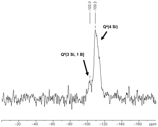 The 29Si CP MAS NMR spectrum (Figure 6) shows two broad signals representing 4-connected Si-units which are assigned to Q4-type silicon atoms [Si3B1] for the peak at δ -103.0 ppm, and Q4-type silicon [Si4] at δ −109.3 ppm. The intensity ratio of the signals is Q4[Si3B1]:Q4[Si4] ≈ 1:5. The low Q4[Si3B1]:Q4[Si4] ratio and the fact that there are no 4-connected Si-units with [Si2B2] are indicative of a low boron content of about Si/B ≈ 10.